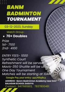 (Please subscribe email notification for upcoming North India Badminton Tournaments. Click here to Subscribe)
